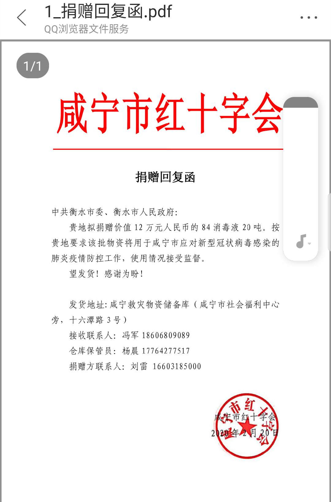 2月22號(hào),衡水市捐贈(zèng)湖北省咸寧市的20噸價(jià)值12萬(wàn)元的84消毒液,在我公司緊急生產(chǎn)完成并裝車(chē),帶著衡水人民對(duì)湖北人民的深情厚誼,啟程奔赴湖北省咸寧市,由咸寧市紅十字會(huì)接收,助力當(dāng)?shù)氐囊咔榉揽毓ぷ鳌?/div>